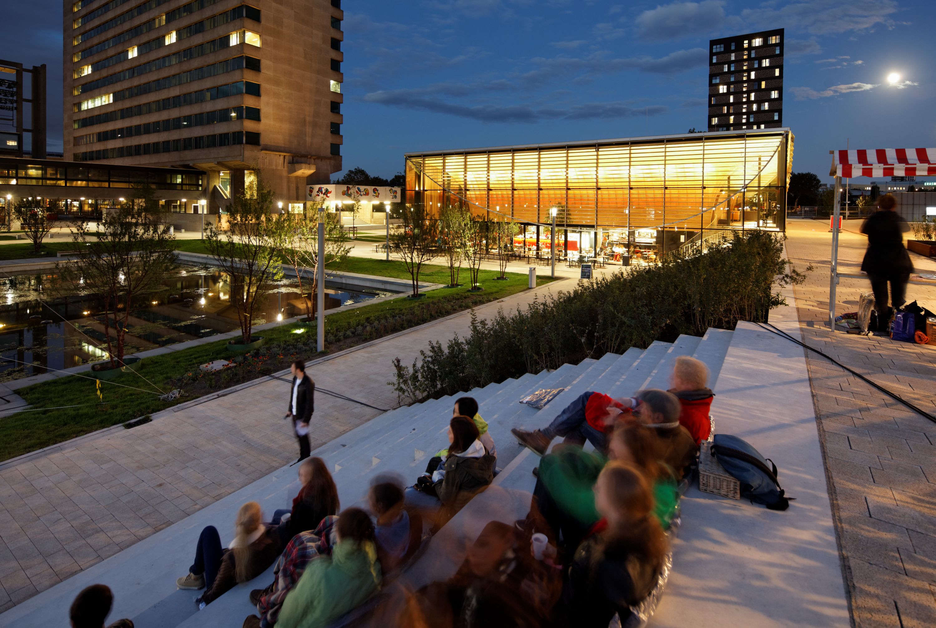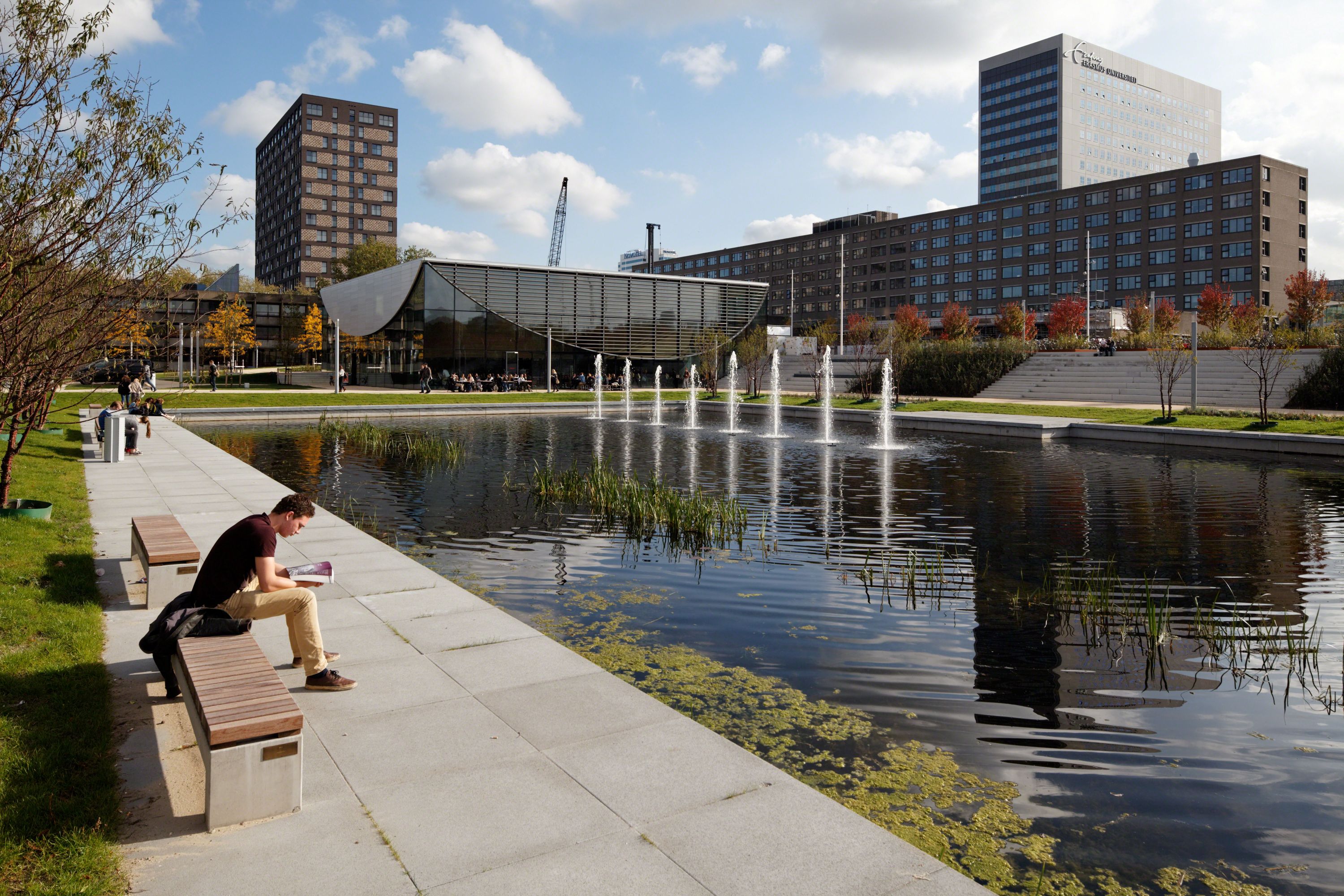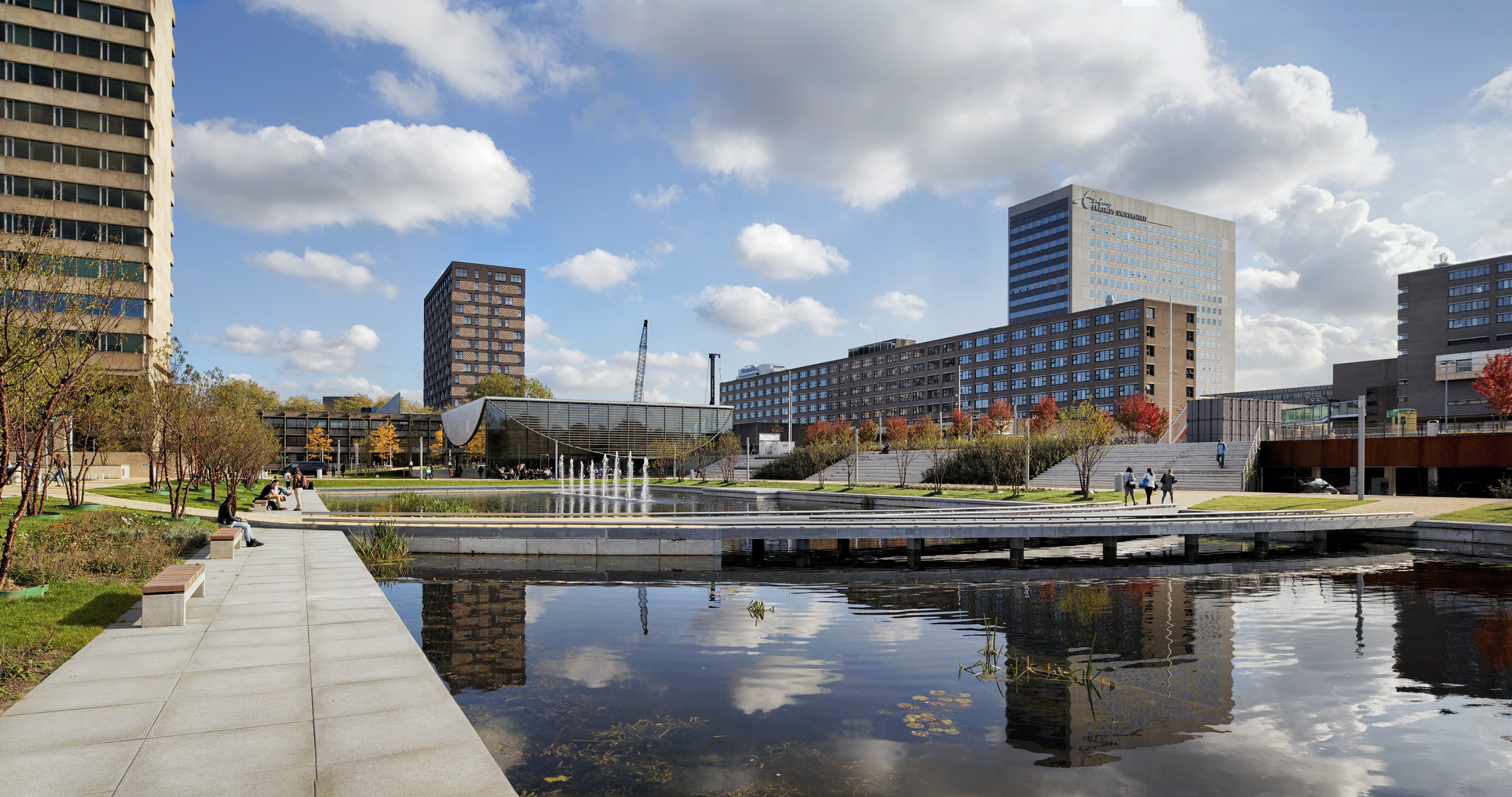 The original Erasmus University campus is a product of the 1960’s, a collection of individually designed concrete buildings and parking lots. The redesign of the campus provides a new sense of place, orientation, and identity, a strategy that allowed for future expansion and most of all: a new social heart, a ‘Place to Be’.