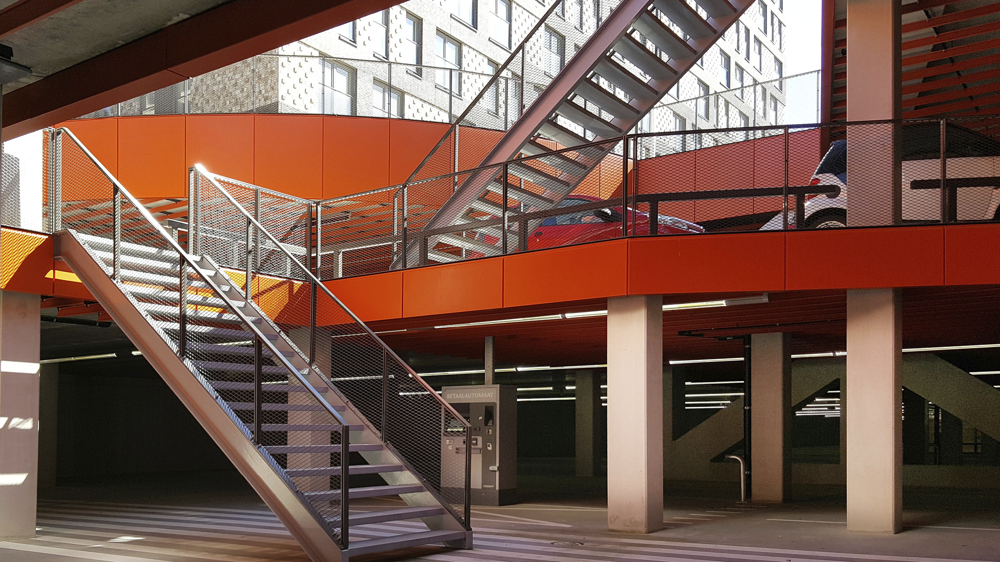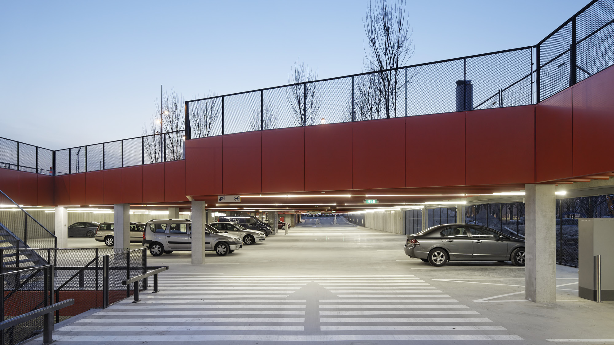 The parking garage can accommodate up to 1000 cars divided over two layers. Spatial features have been designed to enhance the wayfinding and orientation in the garage: Two open air voids and a red louvered ceiling all across the parking layers. These features will make the experience of entering and exiting the garage, both by car and as a pedestrian, appropriate for the campus of this prominent university.
