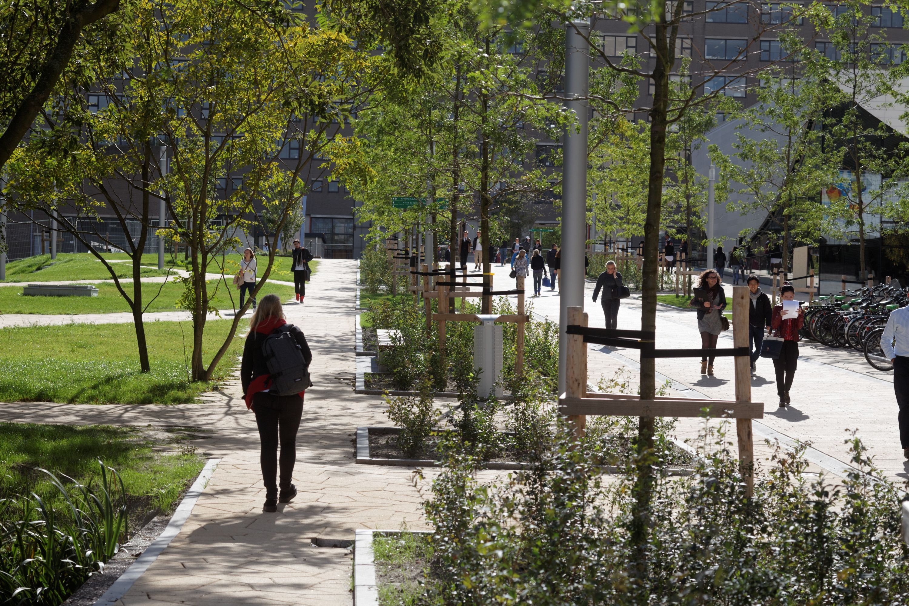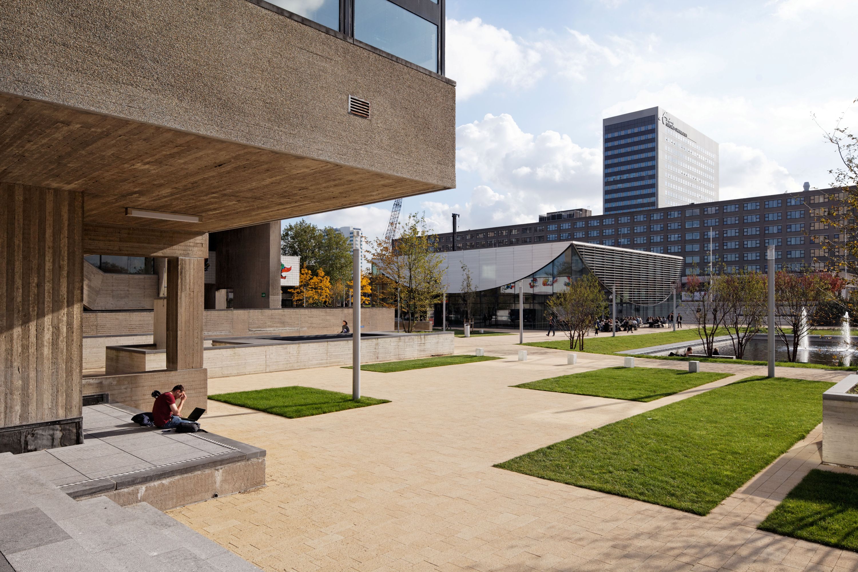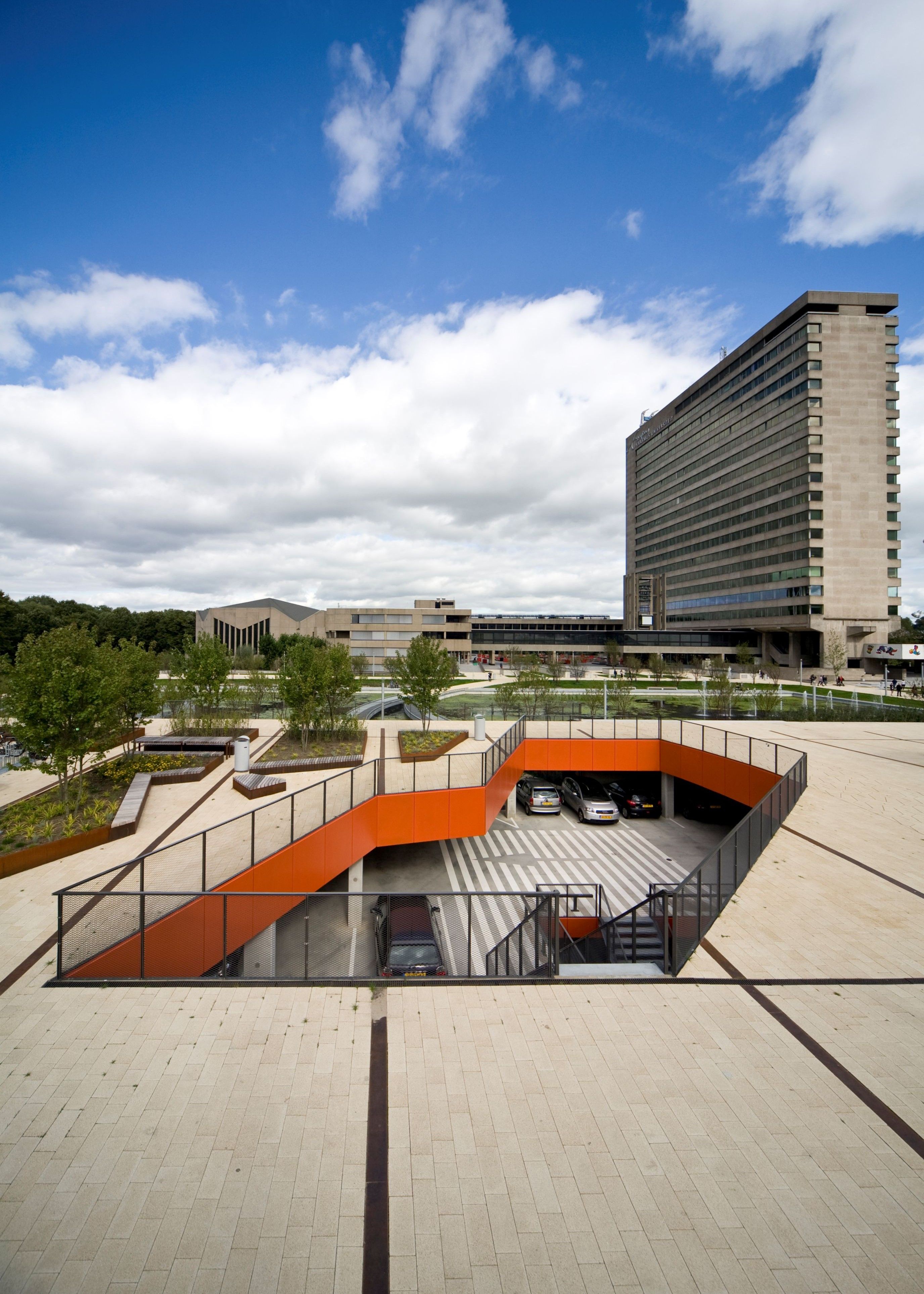 One of the central features in the development of Erasmus University master plan is the half-sunk garage connected to the Erasmus Plaza on the roof. This construction marks the new central main entrances of the university campus.