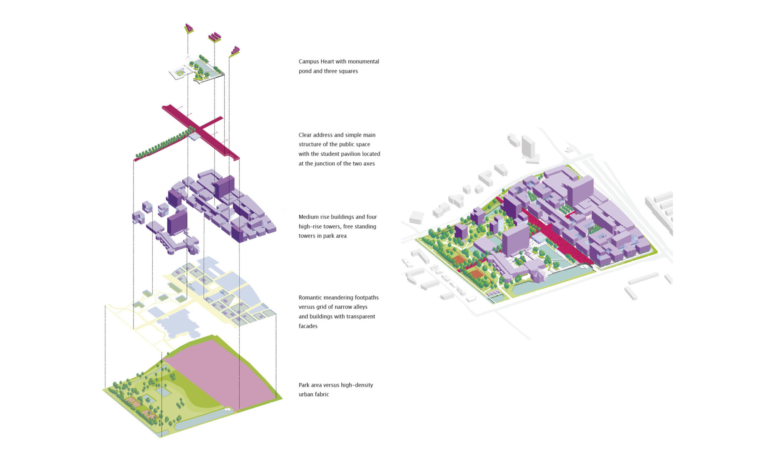 The urban design connects architecture and landscape within a clear framework featuring strong sightlines, interspersed with places to linger and green structures. A central pond functions as part of a water management system: it provides water retention capacity and forms the backbone of a sustainable ecological structure. A new restaurant, exhibition space, and theatre are combined in a central student pavilion.