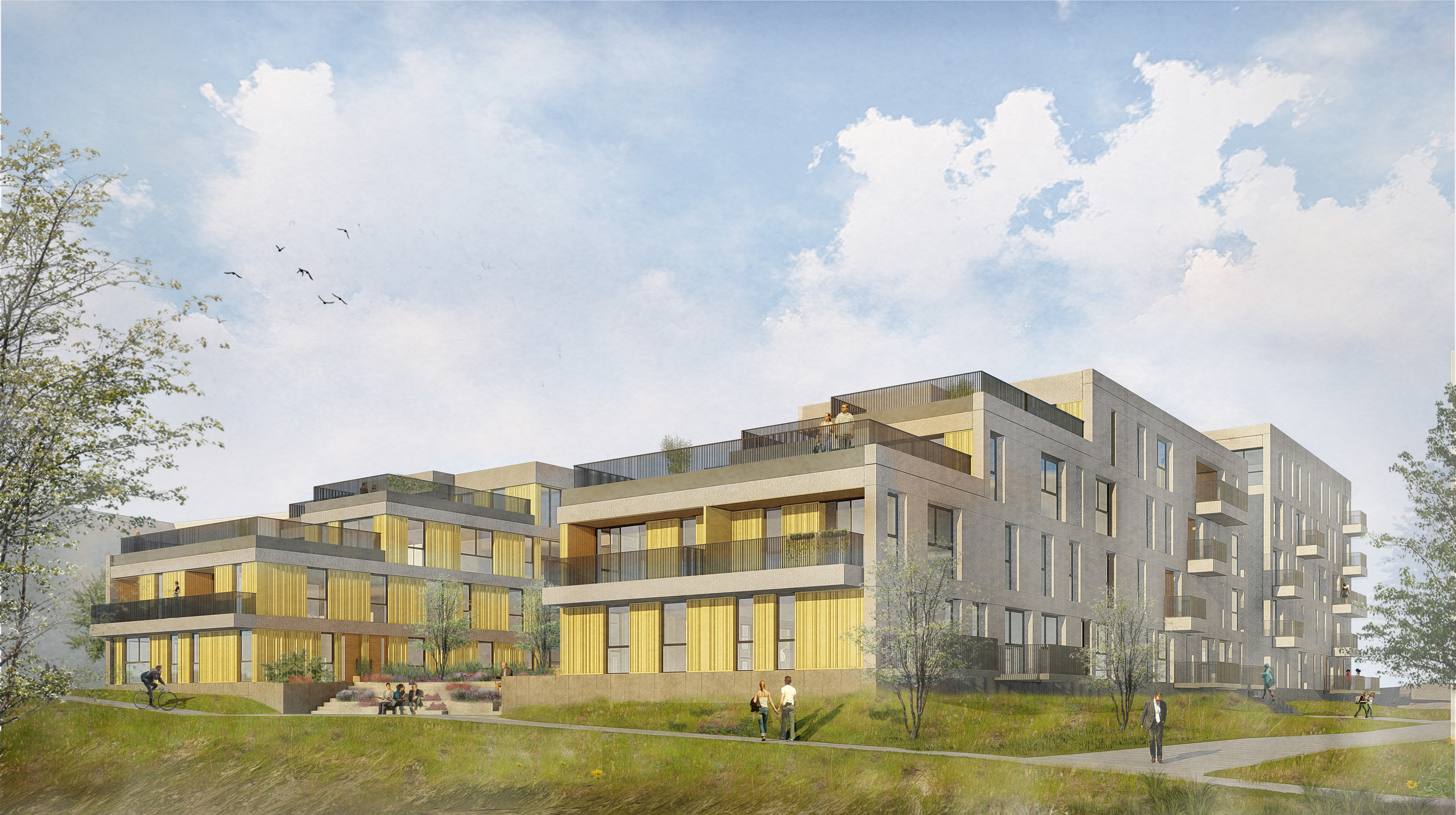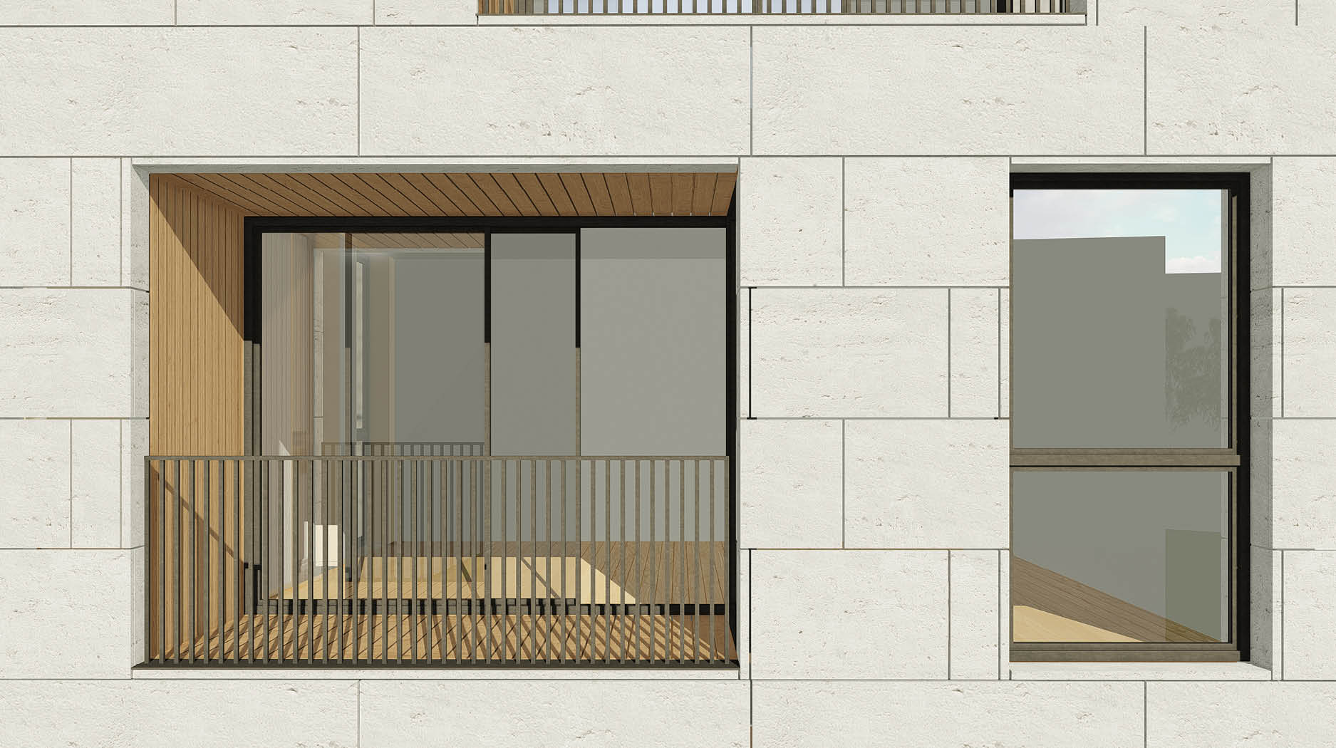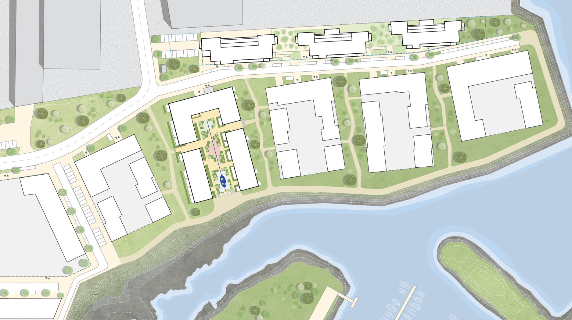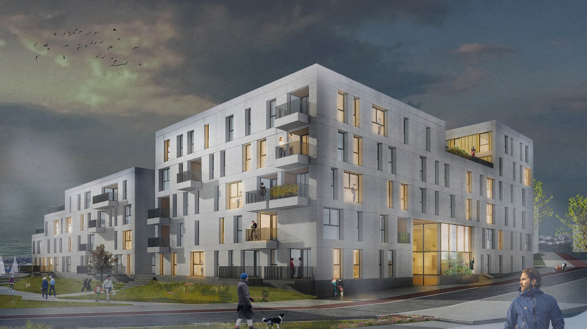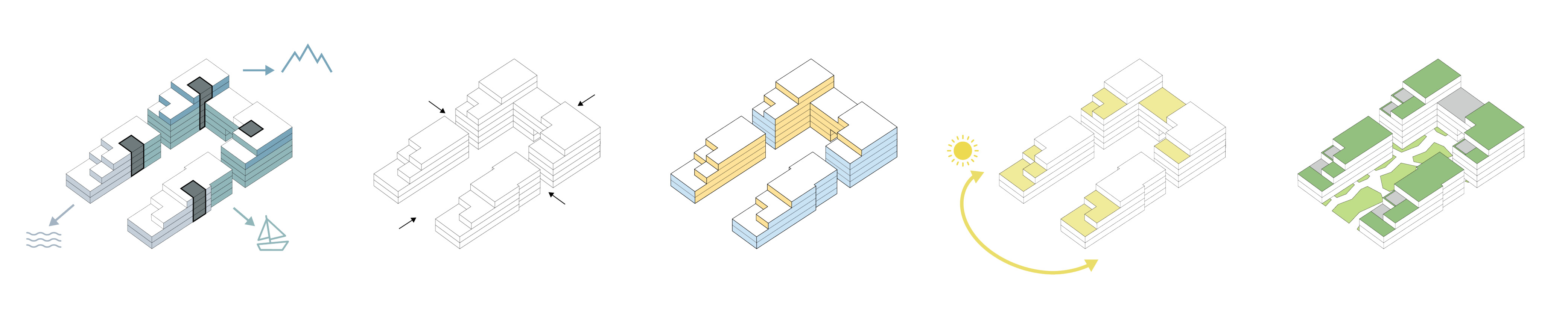 A robust sculptural volume that steps down in terraces from the urban street toward the water, maximising sun exposure and views over the adjacent marina. The building anchors a sheltered communal courtyard at its heart: a warm, protected space that opens toward hiking and cycling trails and faces the sea.