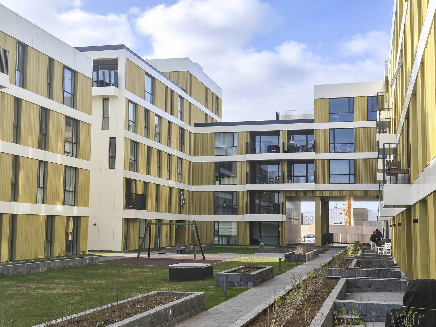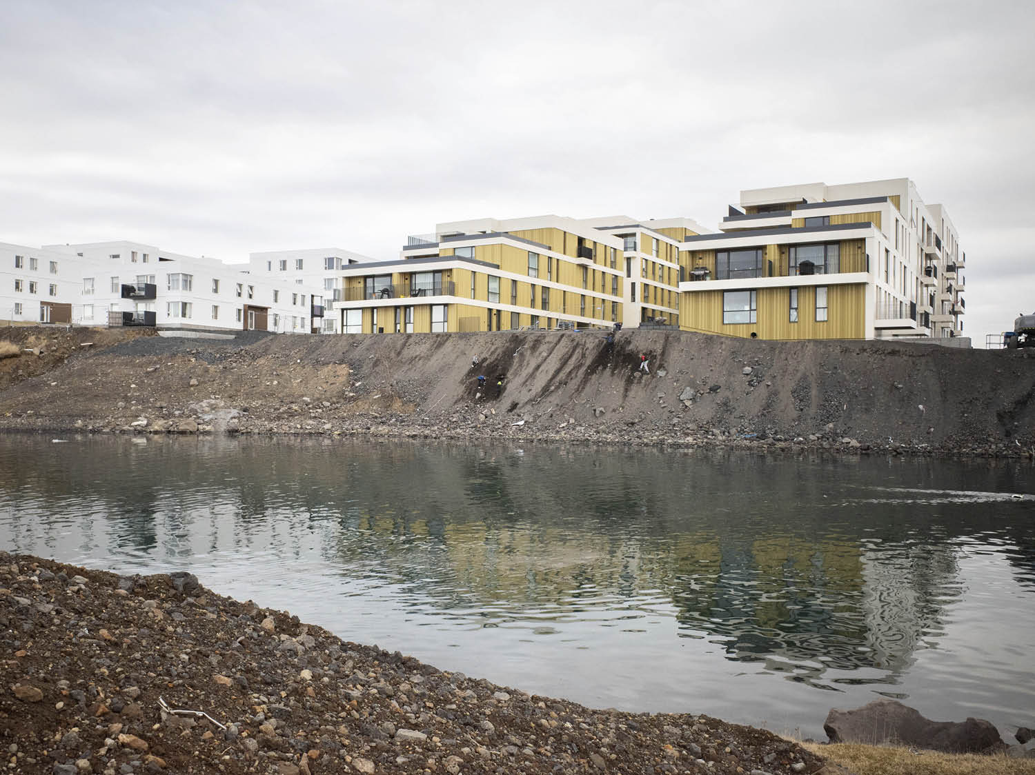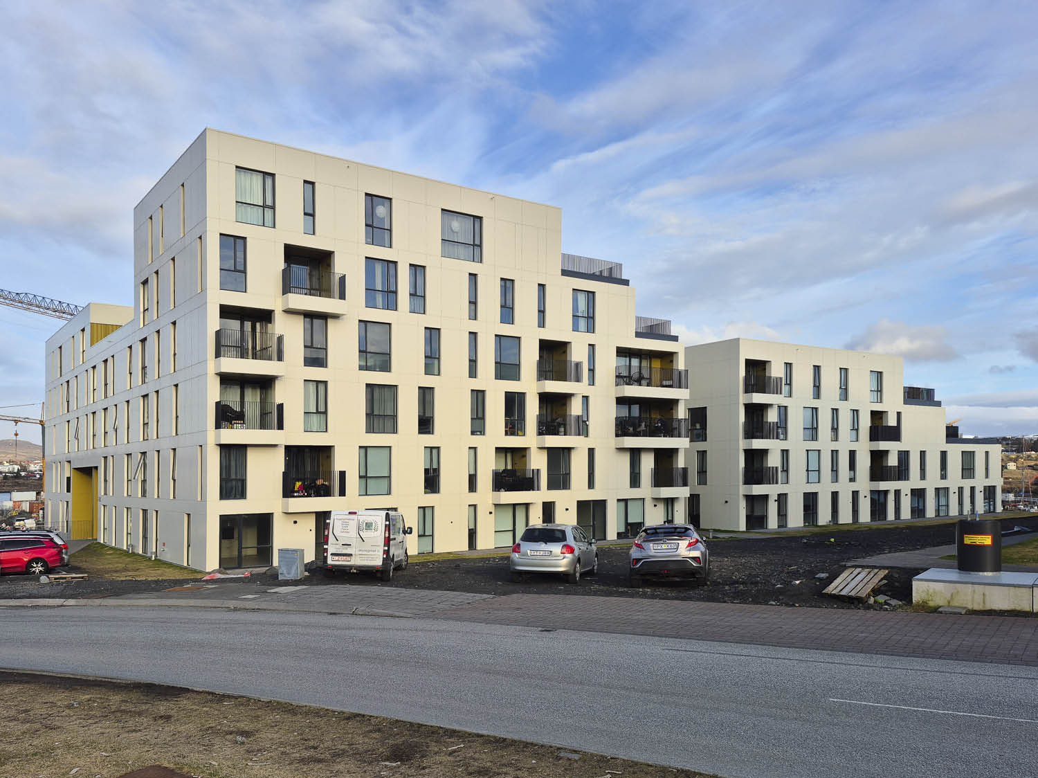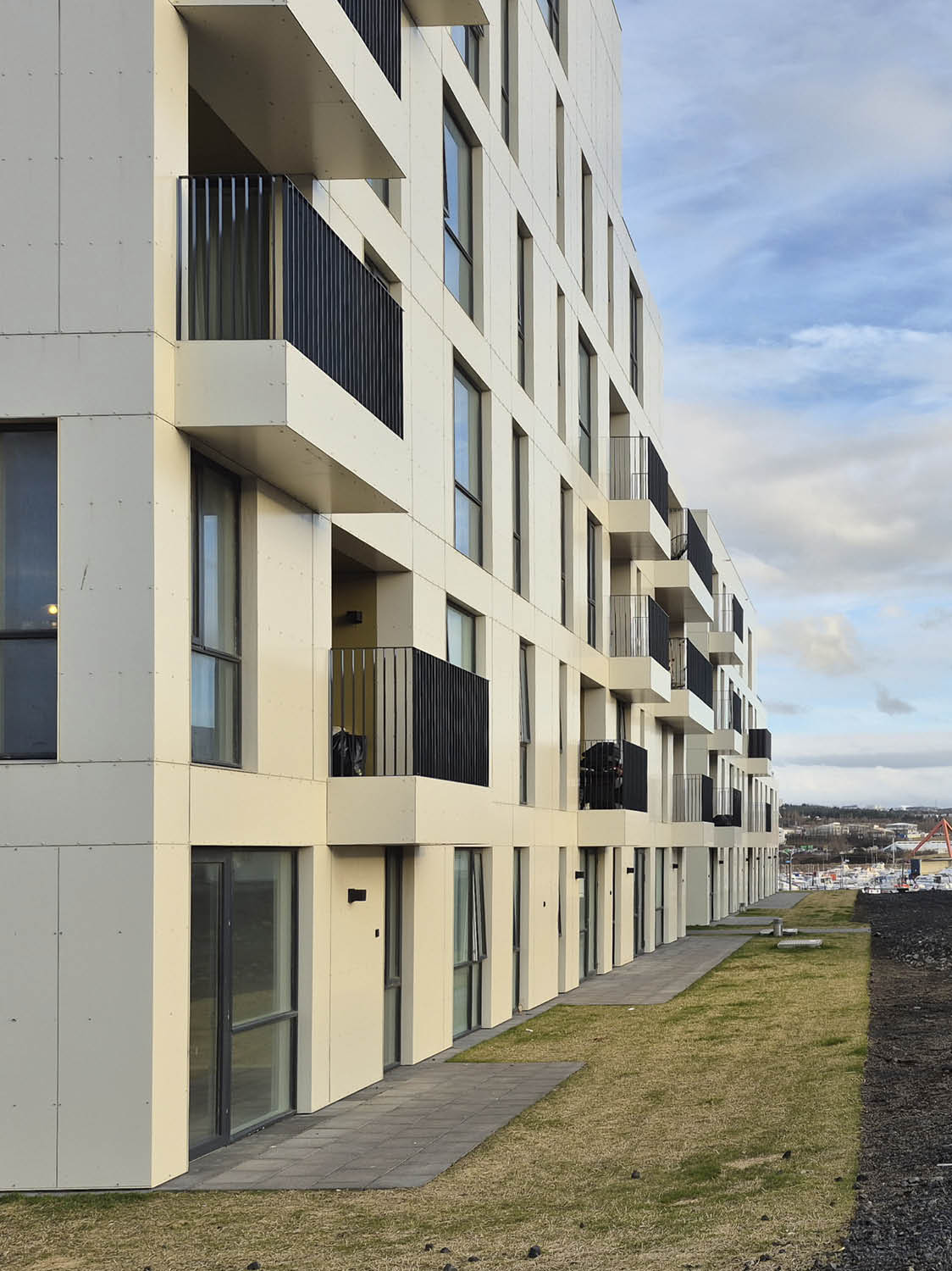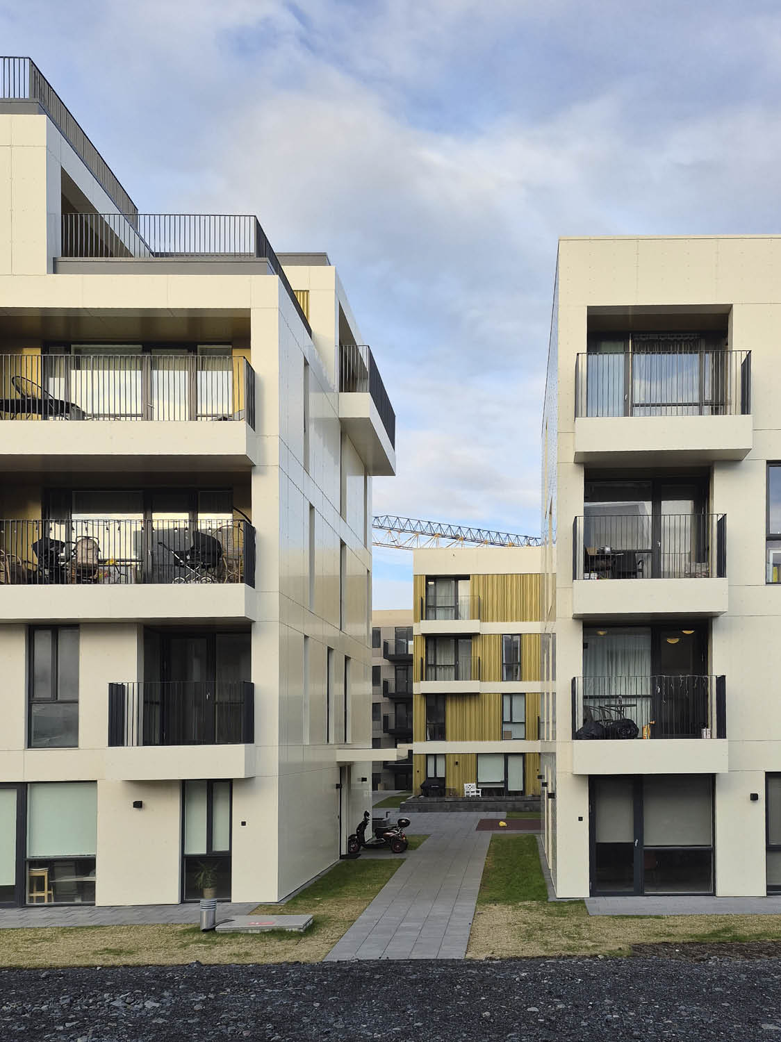 Vogabyggð is Iceland's next generation of sustainable urban development – a new community by the sea that transforms a former industrial peninsula into a vibrant, human-scale neighbourhood. Within the masterplan of Vogabyggð, JVST has been commissioned to design a series of waterfront apartment buildings on the former industrial peninsula of Gelgjutangi. The Open courtyard building (1.2) is the first of these – a robust sculptural volume that steps down in terraces from the urban street toward the water, maximising sun exposure and views over the adjacent marina. The building anchors a sheltered communal courtyard at its heart: a warm, protected space that opens toward hiking and cycling trails and faces the sea.