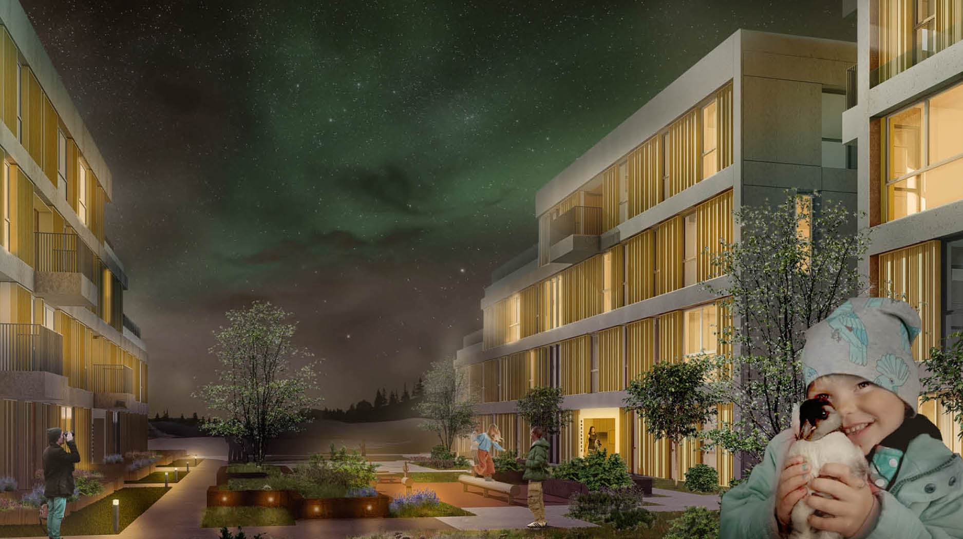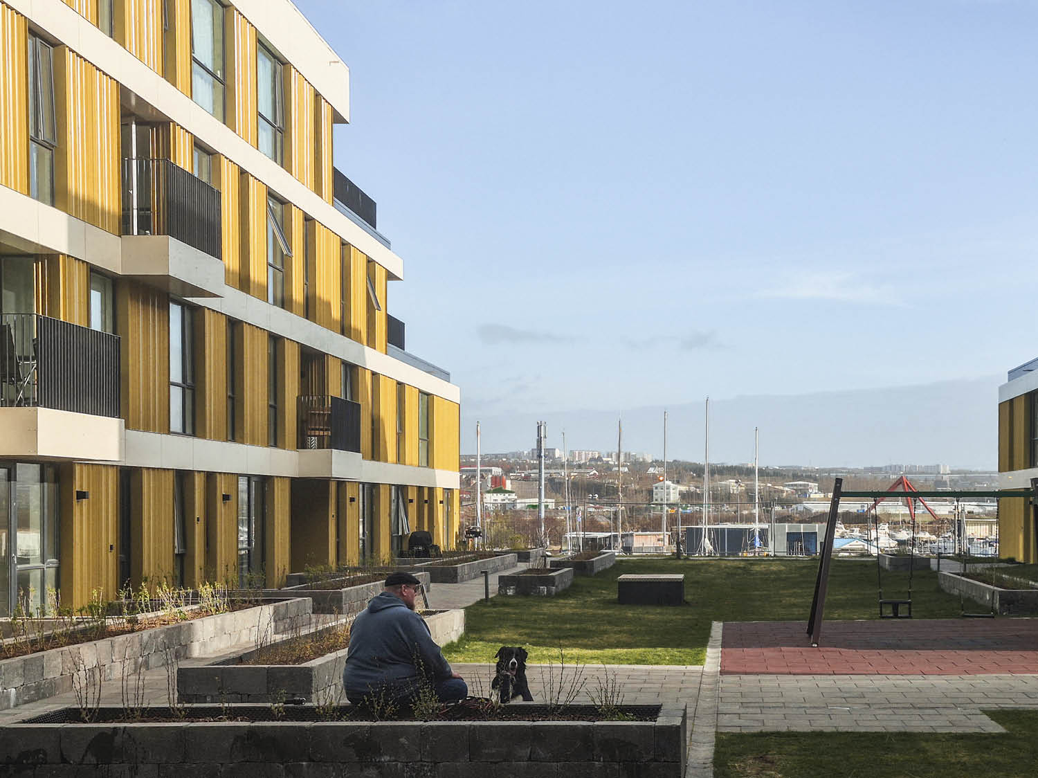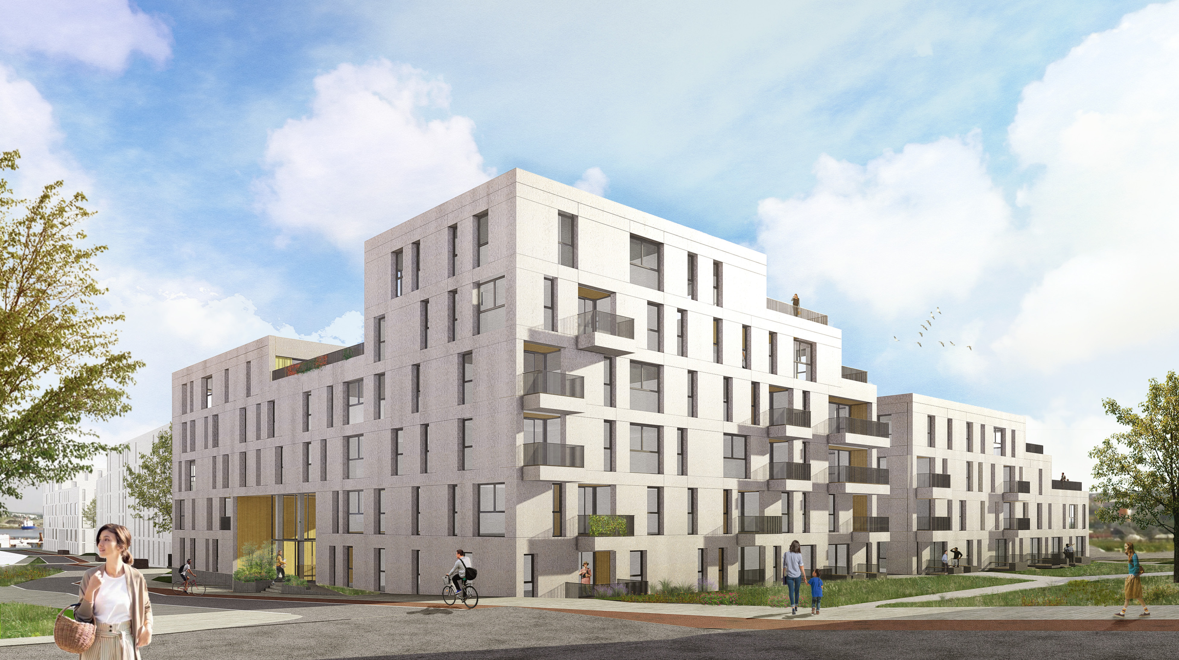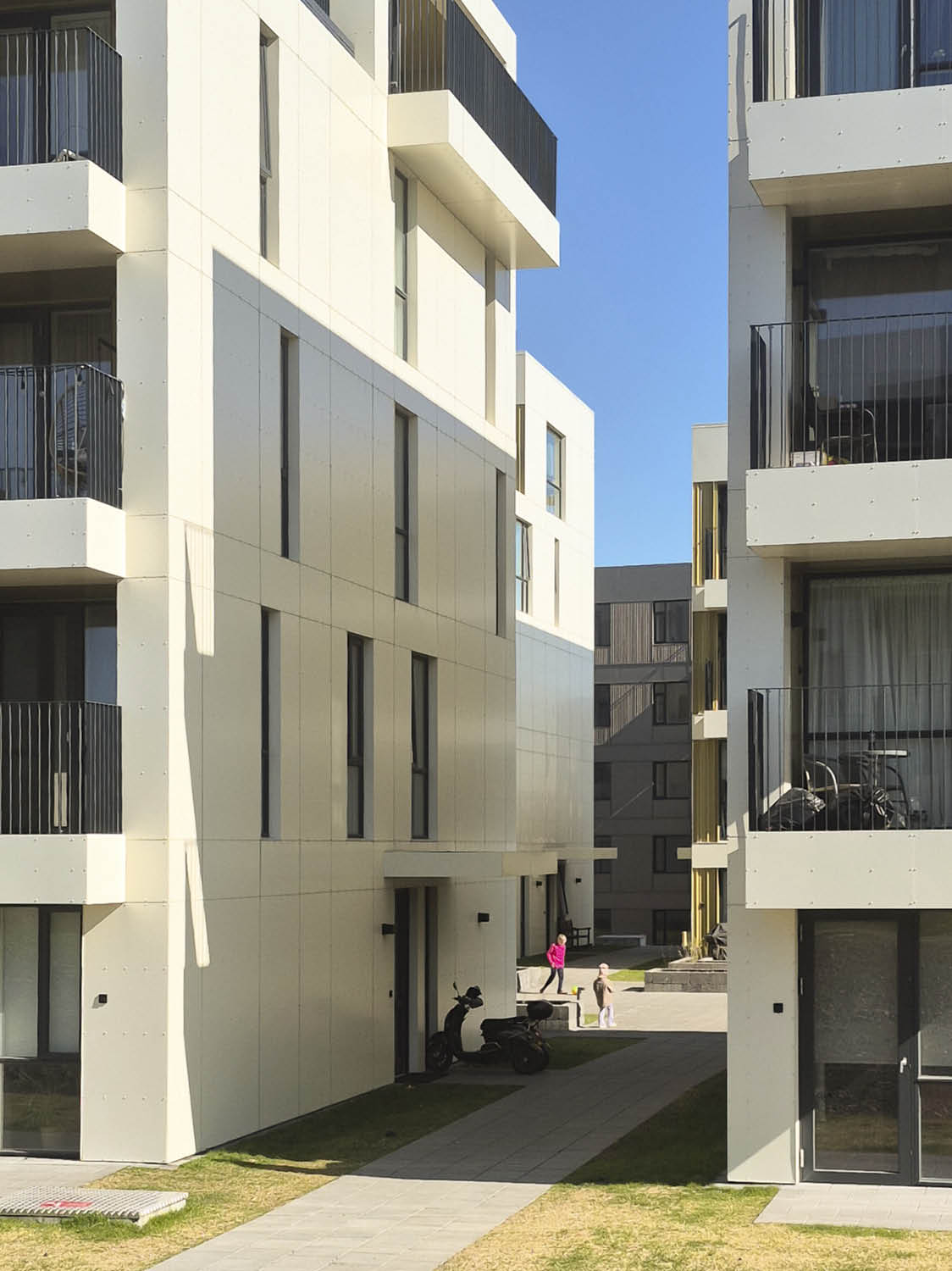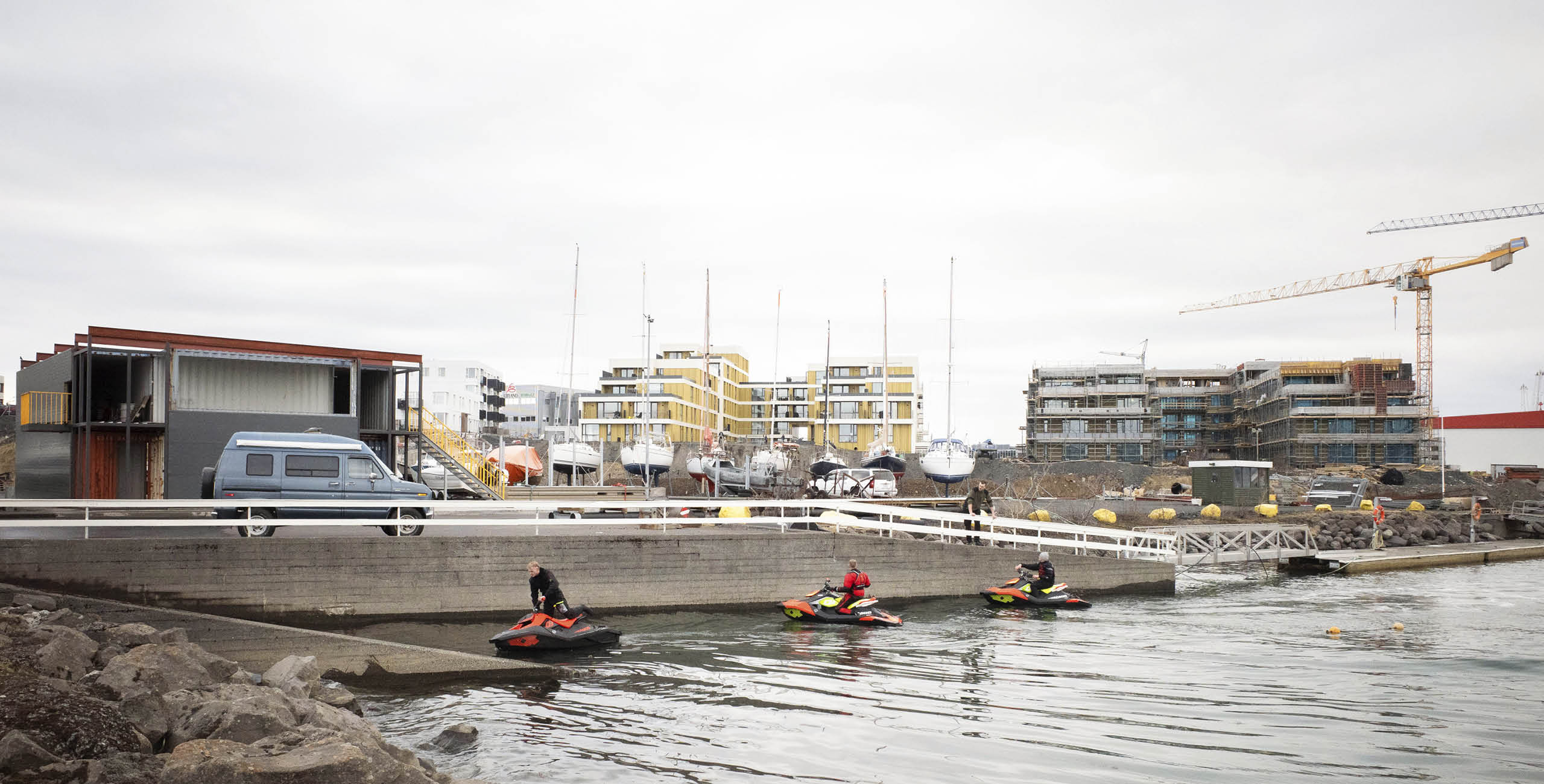 Vogabyggð is Iceland's next generation of sustainable urban development – a new community by the sea that transforms a former industrial peninsula into a vibrant, human-scale neighbourhood. Within the masterplan of Vogabyggð, JVST has been commissioned to design a series of waterfront apartment buildings on the former industrial peninsula of Gelgjutangi. The Open courtyard building (1.2) is the first of these – a robust sculptural volume that steps down in terraces from the urban street toward the water, maximising sun exposure and views over the adjacent marina. The building anchors a sheltered communal courtyard at its heart: a warm, protected space that opens toward hiking and cycling trails and faces the sea.