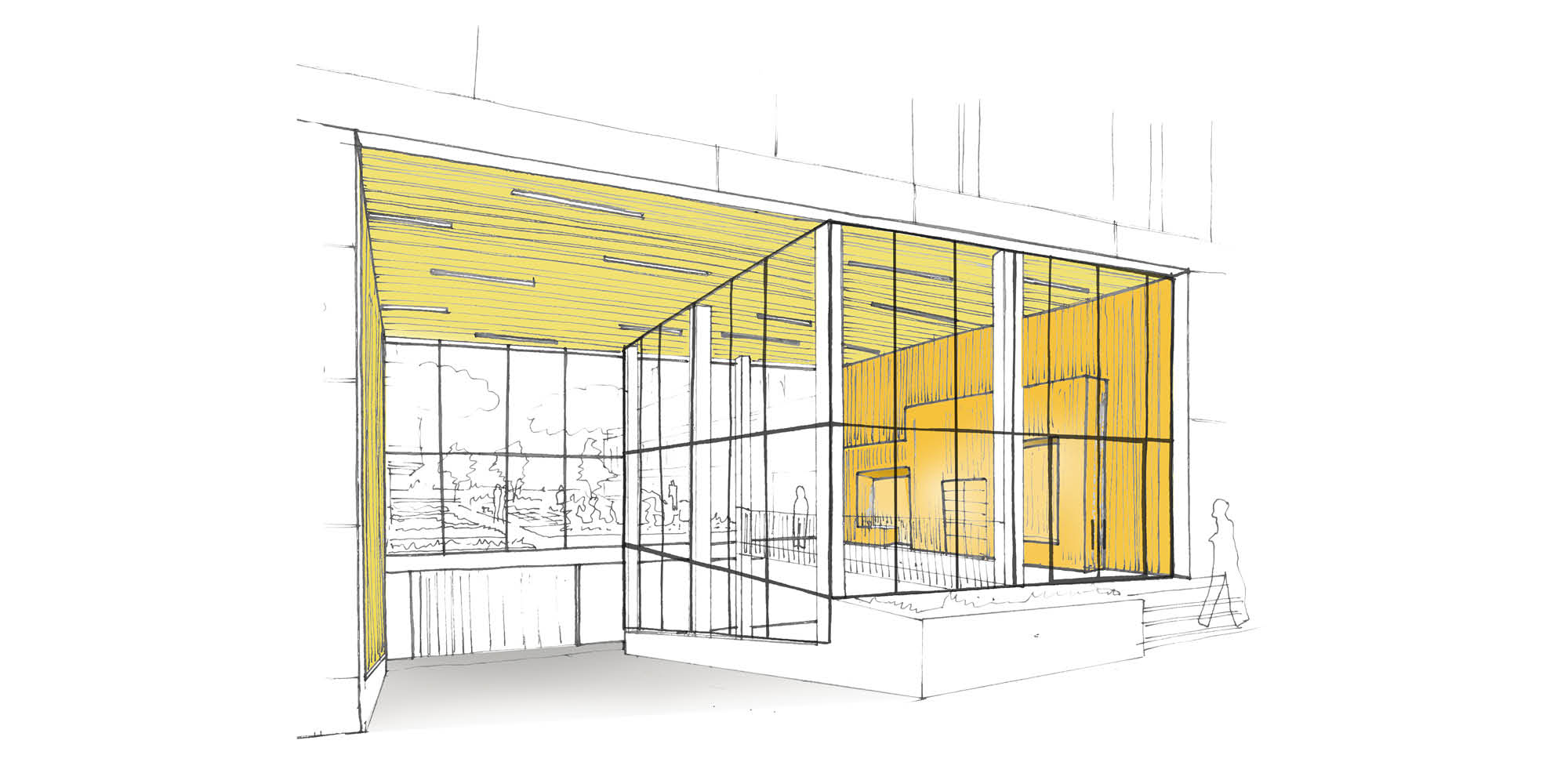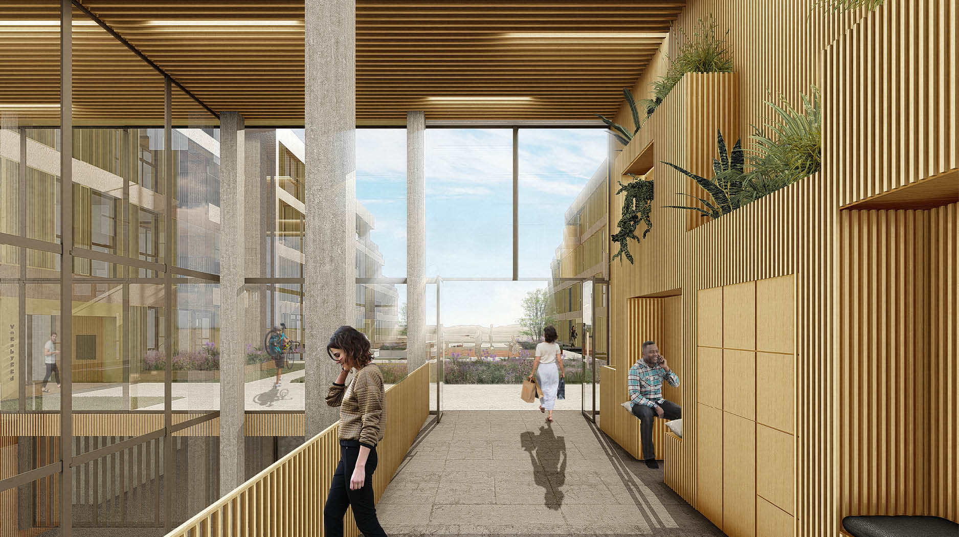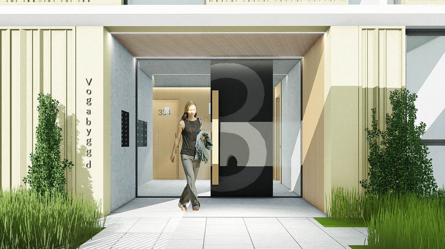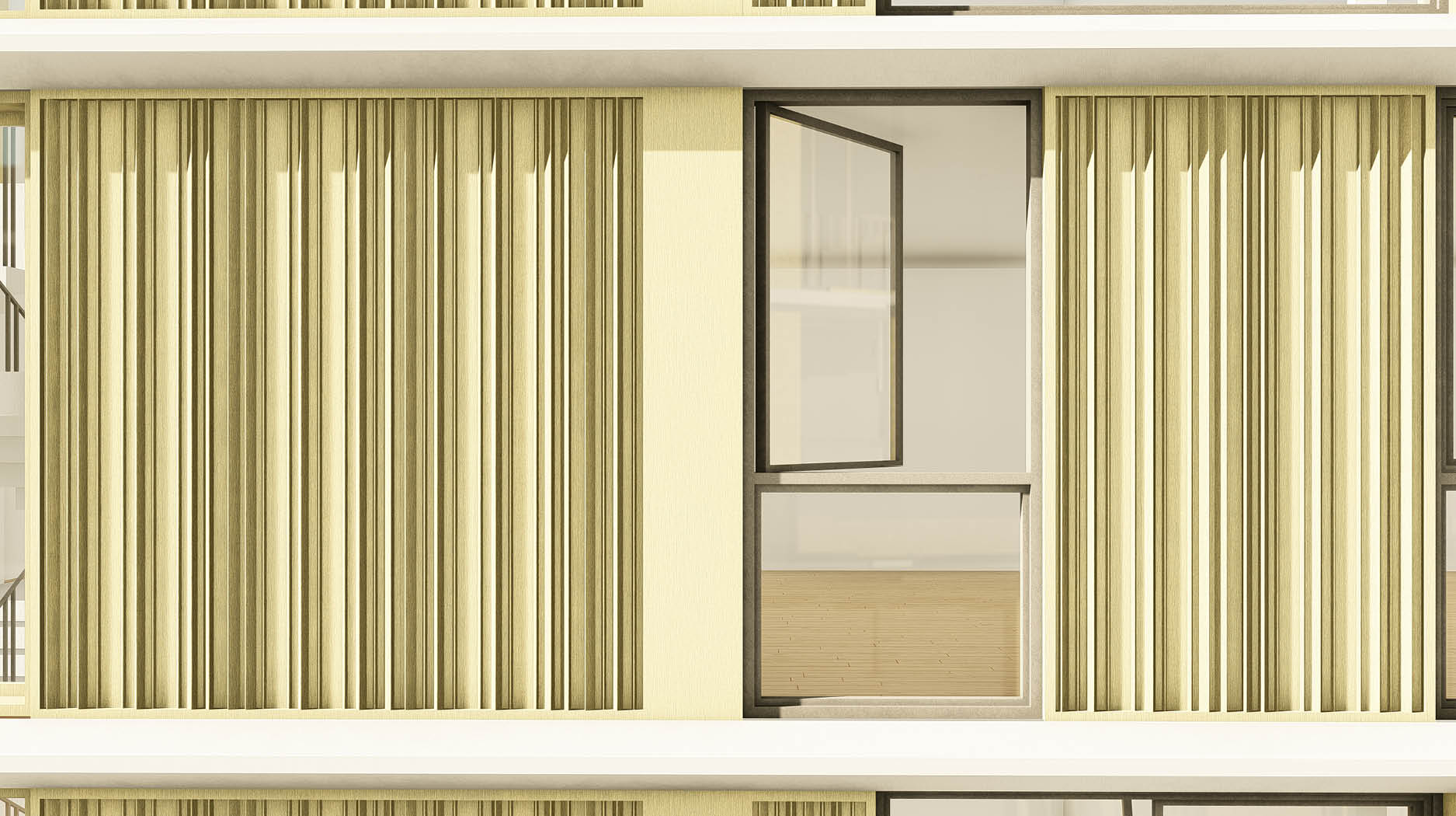 The entrance is conceived as a contemporary arch – a single gesture that welcomes pedestrians, cyclists, and cars from the street into the garden. On the exterior, robust light grey-silver aluminium panels reference the texture and tone of weathered timber, grounding the building in its coastal industrial heritage. Inside the courtyard, gold-coloured panels shift the atmosphere entirely: warm, tactile, and glowing – a deliberate contrast that makes the shared space feel distinct and inviting.